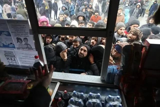 2021年11月19日,难民在白俄罗斯与波兰边境白方一侧等待领取食物,俄罗斯呼吁白方与欧盟直接接触。(来源:新华社)
