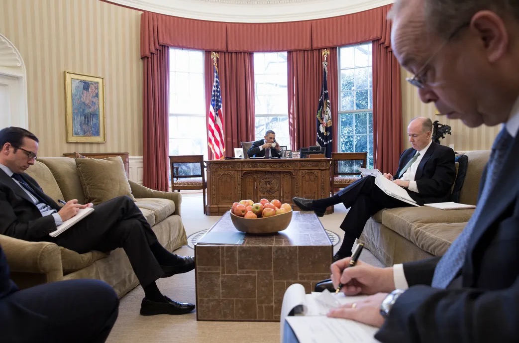 2013年奥巴马在椭圆形办公室接听外国领导人电话,左一为时任白宫国安会亚洲事务主任麦艾文