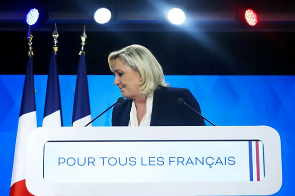 2022年4月24日,法国总统候选人勒庞在巴黎发表演讲,承认败选。