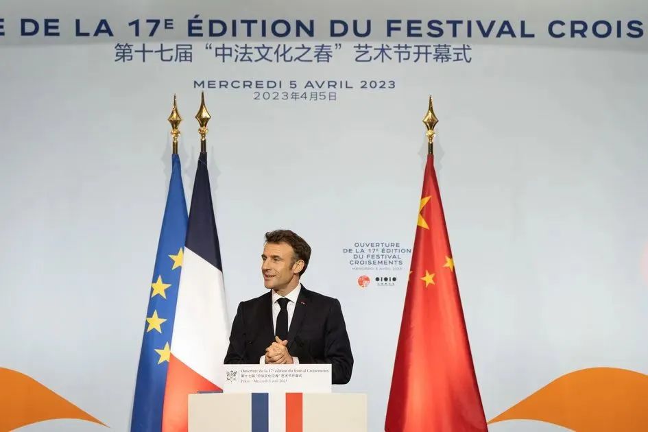 4月5日晚,法国总统马克龙抵达中国后出席第17届“中法文化之春”艺术节开幕式。