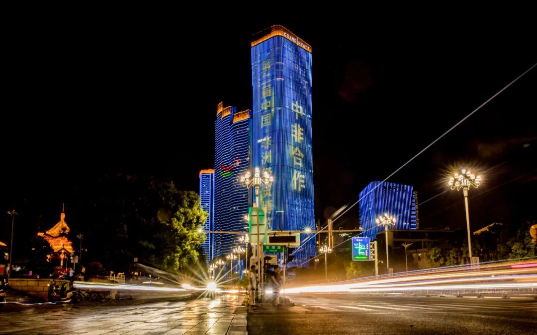 2021年9月26~28日,第二届中非经贸博览会在长沙举办,一座大楼的巨型显示屏上,打出了“中非合作”的宣传语。