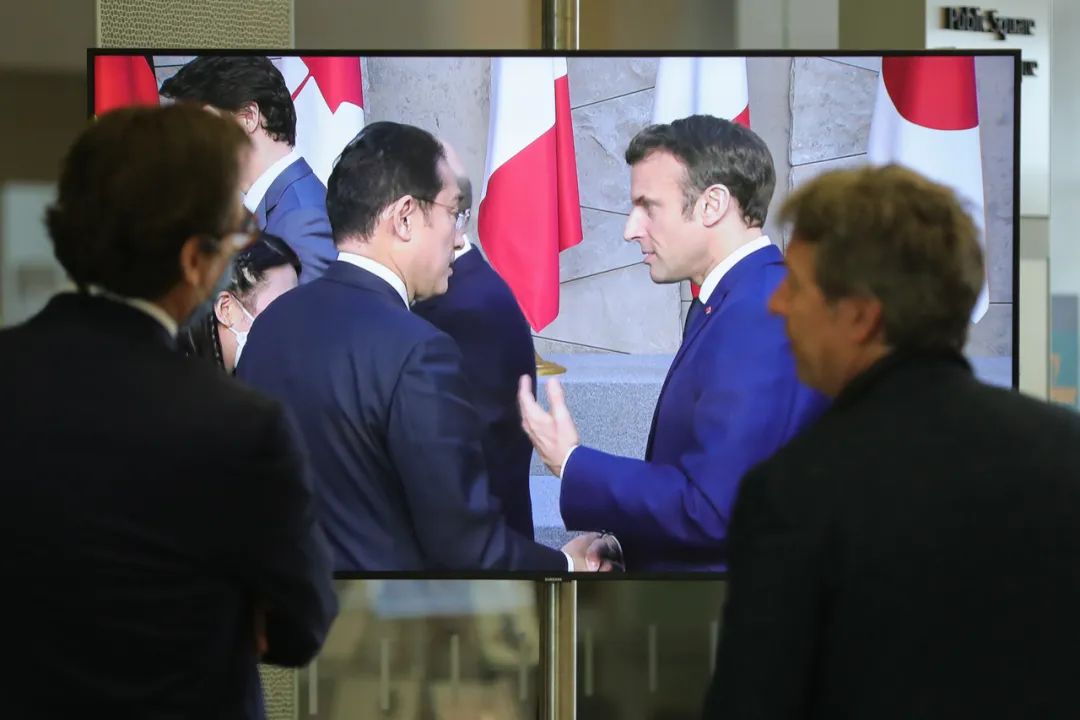 3月24日,人们观看屏幕上日本首相岸田文雄、法国总统马克龙出席七国集团峰会的画面
