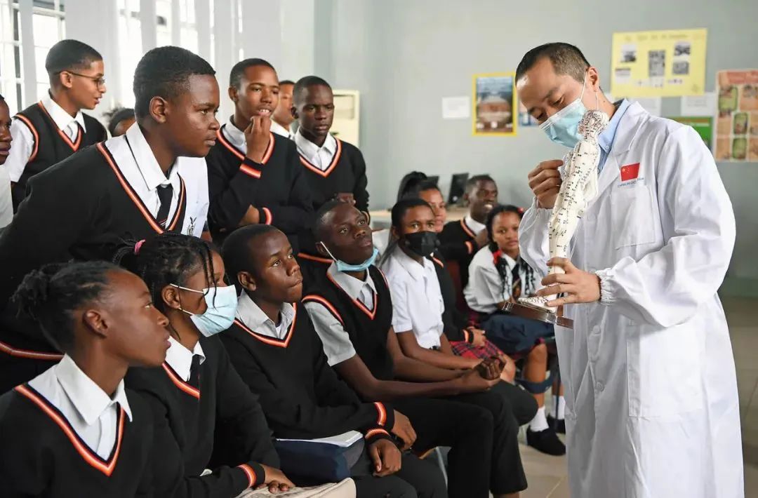 2022年11月3日,在纳米比亚首都温得和克的毛泽东主席中学,中国援纳医疗队医生为学生讲解人体穴位模型。(图源/新华社)