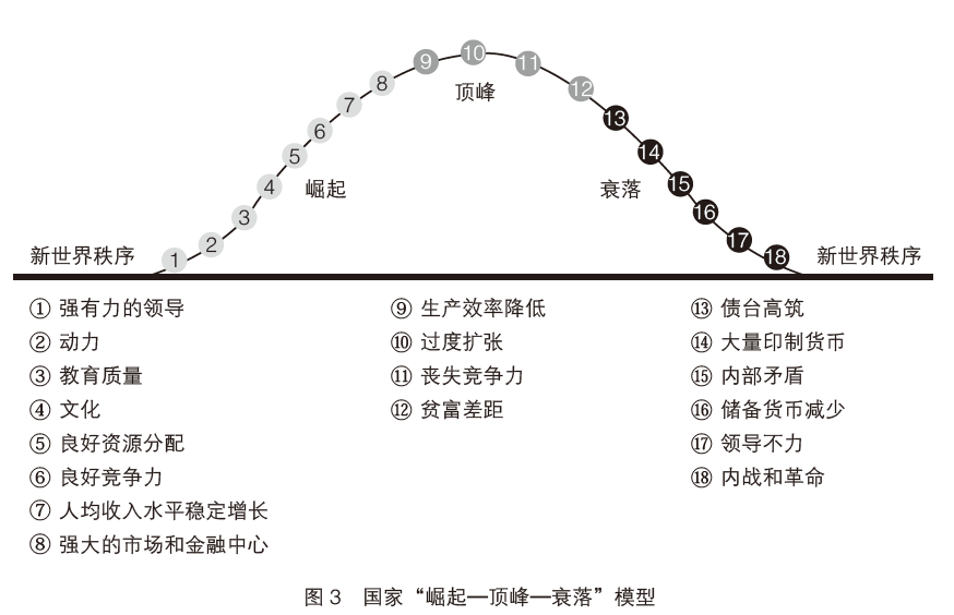 作者随即以国家“崛起—顶峰—衰落”的模型概括了帝国权力是如何变化的。达利欧在书中将国家崛起定义为“新世界秩序中一段繁荣发展的时期”,国家在这段时期培养和建立起了强大的发展实力。这样的发展实力是由低负债、少分歧、高效率、优秀的教育系统和基础建设、稳固强大的国家领导层以及由一国或多国共同维护的和平世界秩序等因素共同决定的。这些先决条件保障了公民收入水平、对基建、教育和科研的投资、鼓励私营企业、发展资本市场、建设金融中心城市(如阿姆斯特丹、伦敦、纽约和上海),并最后将本国货币打造成世界主要储备货币等发展打下了基础。