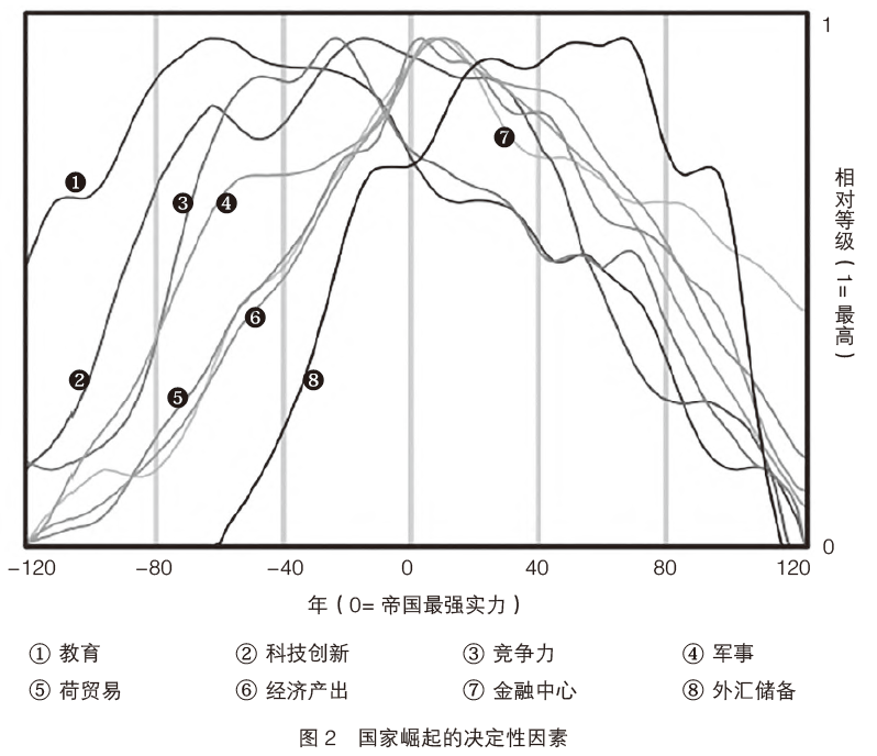 这8条决定性因素即构建了所谓的“典型国家兴衰周期”:如图2所示,国家崛起伊始都伴随着对教育的高度重视,从而导致创新技术和科技的兴起;创新科技提高了国家竞争力,带来了尖端产品,推动贸易,武装军队,提高经济产出,建设重要金融中心城市;最后,国家拥有了印刷储备货币的资格。随后,这些指标会随着国家实力一同衰落,而即使衰落了,储备货币也会因为使用和交易习惯保留一段时间其作为流通货币的地位。如图2所示,11个国家的国家实力兴衰几乎都可以用这8个指标总结,这印证了作者先前提出的观点,即崛起和衰落都是范式的而非独一无二的。