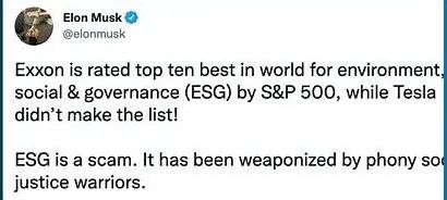 实际上对于ESG的争论或者说持不同意见,不仅仅在美国存在,在世界很多国家都存在。这也不单是因为ESG在操作过程中存在一些公司的夸大和“漂绿”行为,还因为ESG标准不统一而导致对不同公司的ESG评级结果差异较大。比如美国特斯拉汽车公司CEO埃隆·马斯克(Elon Musk)因石油公司埃克森美孚(Exxon Mobil)被标普500指数(The S&P 500)评为全球最佳ESG的前十名,但其做电动汽车的特斯拉却没有上榜,从而谴责ESG是一个骗局。当然,还有更为恶劣的是,一些机构或企业把ESG当成生意做,通过不实和虚假的信息,通过ESG博取名声、获得利益,这都使得人们对ESG产生一些质疑。