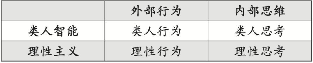 罗素和诺维格指出,有些人根据对人类行为的复刻来定义智能,而另一些人则更喜欢用理性(rationality)来抽象地定义智能(Russell and Norvig, 2021)。智能原本各不相同:一些人将智能视为内部思维过程和推理;而另一些人则关注智能的外部特征,即智能行为。事实上,既有的探讨实际覆盖了4种可能的组合(如表1)(Russell and Norvig, 2021)。