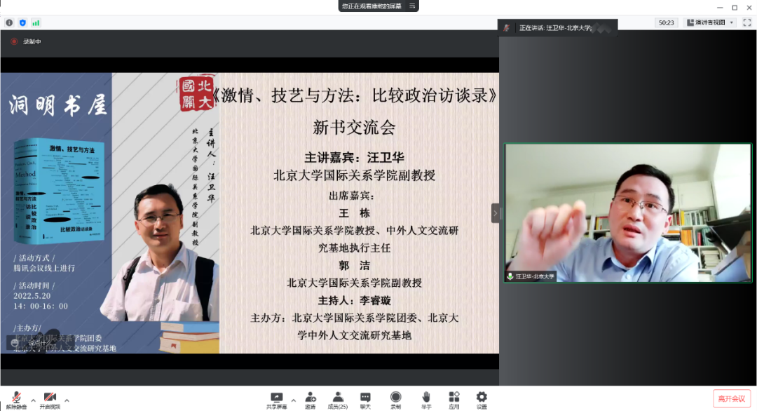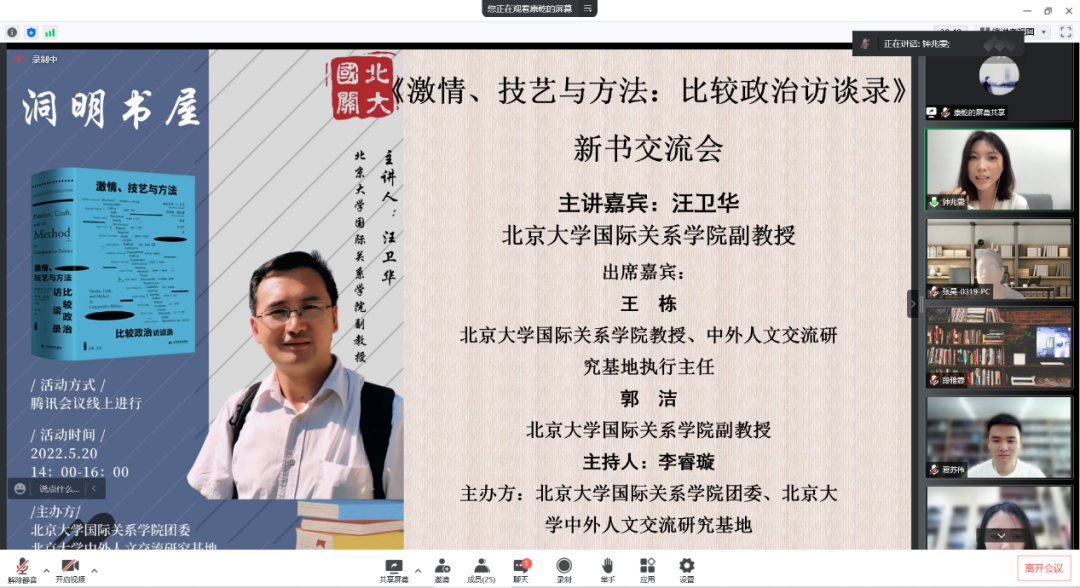 5月20日下午,北京大学国际关系学院第三期“洞明书屋”新书交流会在线上举行,北京大学国际关系学院副教授、比较政治系主任汪卫华作为主讲嘉宾,与老师和同学们交流了他的译著《激情、技艺与方法:比较政治访谈录》。