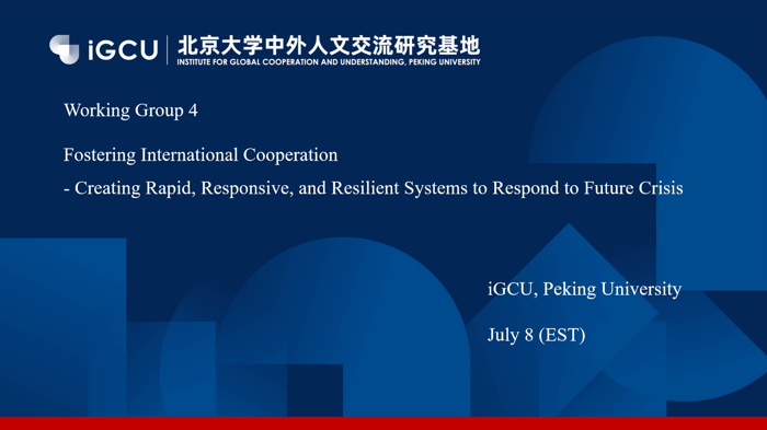 作为第四工作组成员,北京大学中外人文交流研究基地还参加了7月9日晚举行的“全球智库研讨会”第四工作组会议。会议以“促进国际合作——建立快速、灵敏、弹性的体系”为主题,着眼于如何在可预见的未来,协调全球力量与兼顾地方响应,提高危机应对的能力与弹性。
