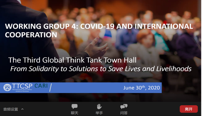 2020年6月30日和7月6-10日,由全球著名智库评价机构——美国宾夕法尼亚大学智库研究项目发起的“全球智库会议”(Global Town Hall Meeting)第三次线上研讨会举行及各专题工作小组系列会议成功举办。作为联合发起智库之一和规划委员会成员,北京大学中外人文交流研究基地连续三次参加该倡议研讨会,与世界各地的智库领袖和专家学者就疫情爆发以来的相关议题持续探讨,并作为第四工作小组成员在专题小组会上,为应对未来共同面临的危机分享了如何加强国际合作的建议。