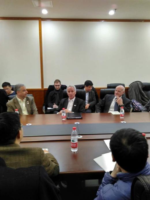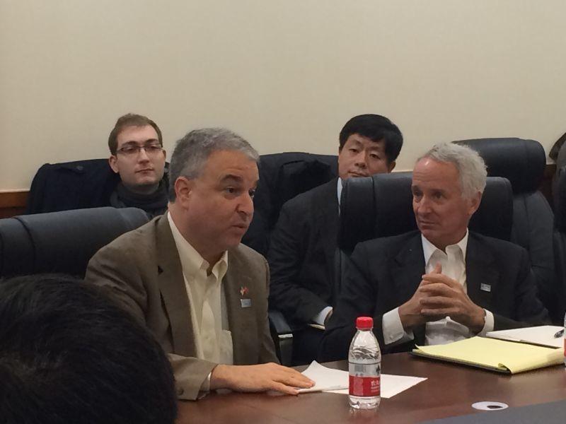 受北京大学中外人文交流研究基地(原北京大学中美人文交流研究基地)和北京大学美国研究中心共同邀请,美国知名智库东西方研究所一行2015年11月19日下午四点半至六点来访我院,并与我院师生举行了座谈。美方代表团成员包括东西方研究所总裁、美国前驻阿富汗大使蒙特(Cameron Munter),东西方研究所所长考恩(Joel H. Cowan),东西方研究所副所长方大伟(David Firestein),美前副助理国防部长布莱克(James Blaker),美前助理贸易代表夏尊恩(Timothy Stratford),美前驻华使馆公使副馆长王晓岷(Robert Wang),布鲁金斯学会约翰·桑顿中国中心高级研究员波拉克(Jonathan D. Pollack)等。北京大学美国研究中心秘书长范士明,中外人文交流研究基地执行副主任王栋副教授,节大磊博士及十余名我院硕士博士生一同参加座谈。此次座谈由王栋老师主持。