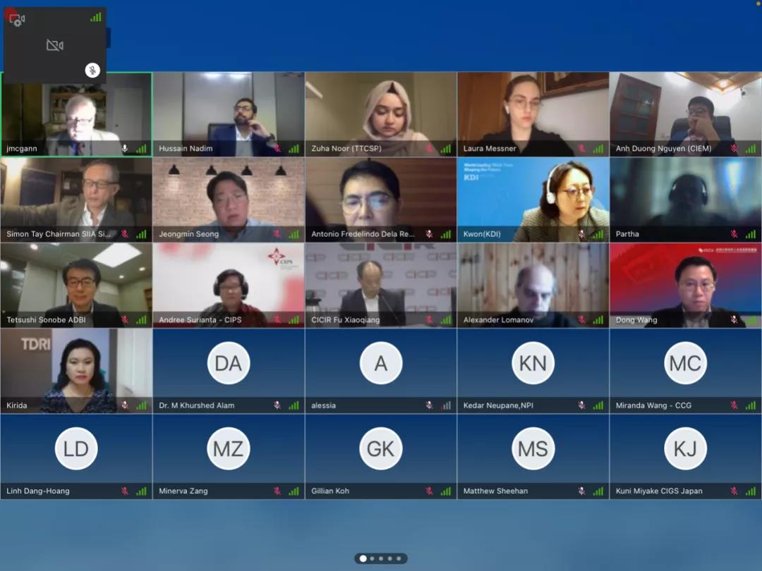 本次峰会共分为两个议题。议题一以“新冠疫情的影响(The impact of COVID 19)”为主题,各国学者围绕新冠疫情的区域和全球影响,从经济、公共卫生、社会与政治层面展开交流。该议题由詹姆斯·麦甘博士主持,东亚东盟经济研究中心(Economic Research Institute for ASEAN and East Asia,ERIA)专家安东尼奥·弗雷德林多·德拉·雷斯马·维拉纽瓦(Antonio Fredelindo Dela Resma VILLANUEVA)、亚洲开发银行研究所(Asian Development Bank Institute)所长兼首席执行官园部哲史(Tetsushi Sonobe)、新加坡国际事务研究所(Singapore Institute of International Affairs, SIIA)主席戴尚志(Simon TAY)、巴基斯坦政府国家卫生事务总理特别助理、传染病专家费索·苏丹(Faisal Sultan)等学者政要参与讨论。