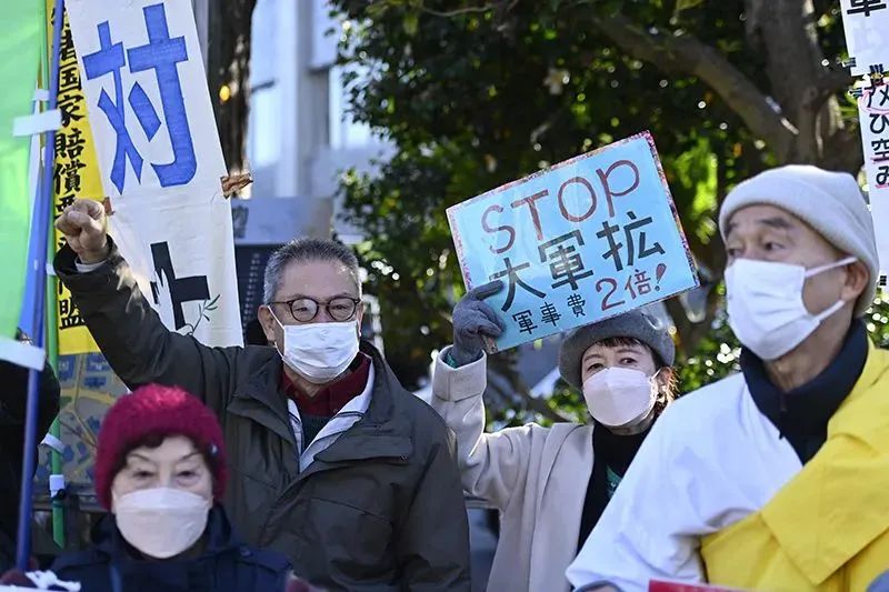 2022年12月16日,抗议者聚集在日本首相岸田文雄官邸外,反对增加防卫费用