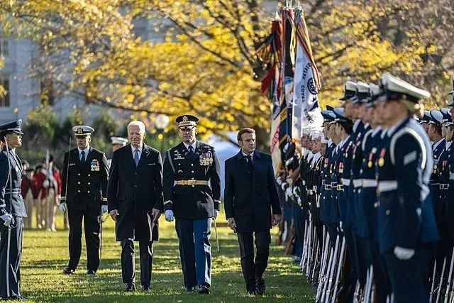 2022年12月1日,在白宫外的草坪上,美国总统拜登、美陆军上校戴夫·罗兰和到访的法国总统马克龙一起检阅部队。