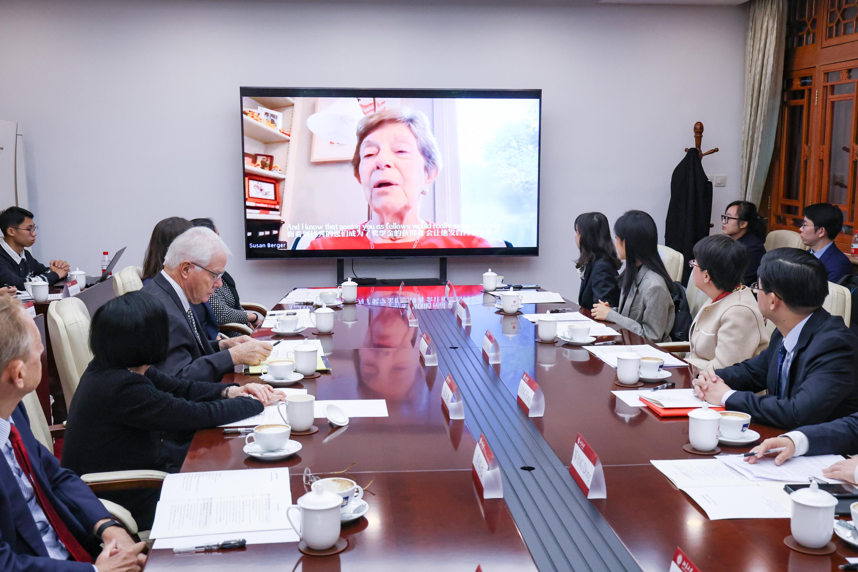 美国前国家安全事务助理萨缪尔·桑迪·伯杰先生遗孀苏珊·伯杰(Mrs. Susan Berger)女士以视频形式代表伯杰家族向获奖学子表示祝贺,并对参与伯杰纪念奖学金相关工作的各位专家学者及双方工作人员表示感谢。她表示,若伯杰先生看到各位奖学金获得者,看到中国青年一代对中美人文交流的热情和做出的贡献,一定会感到十分慰藉。