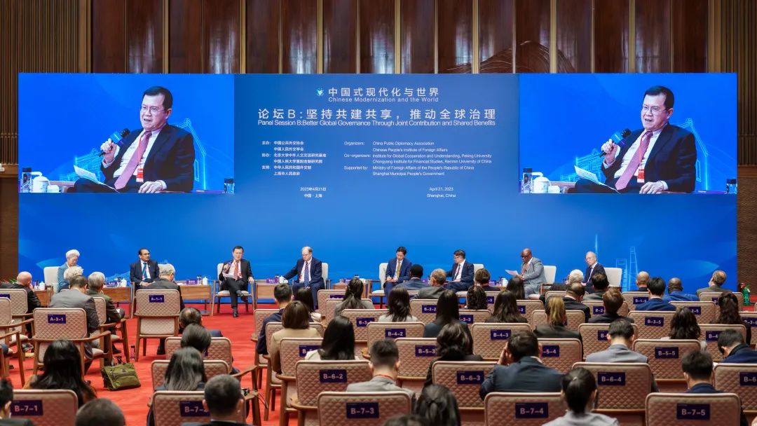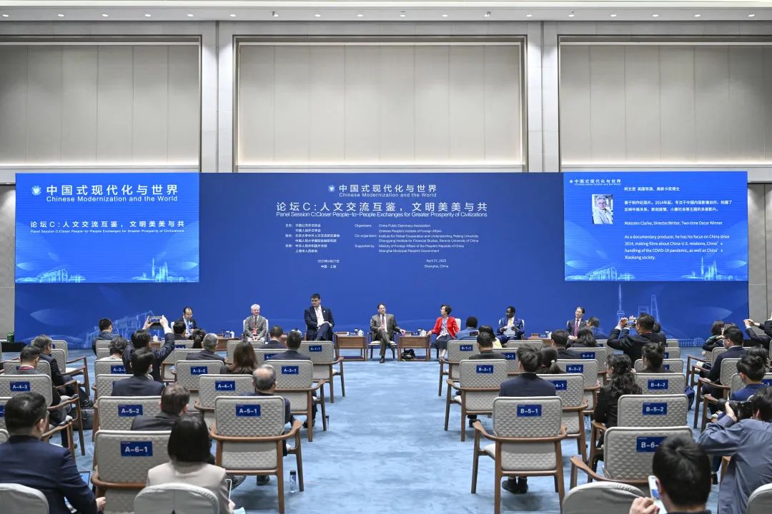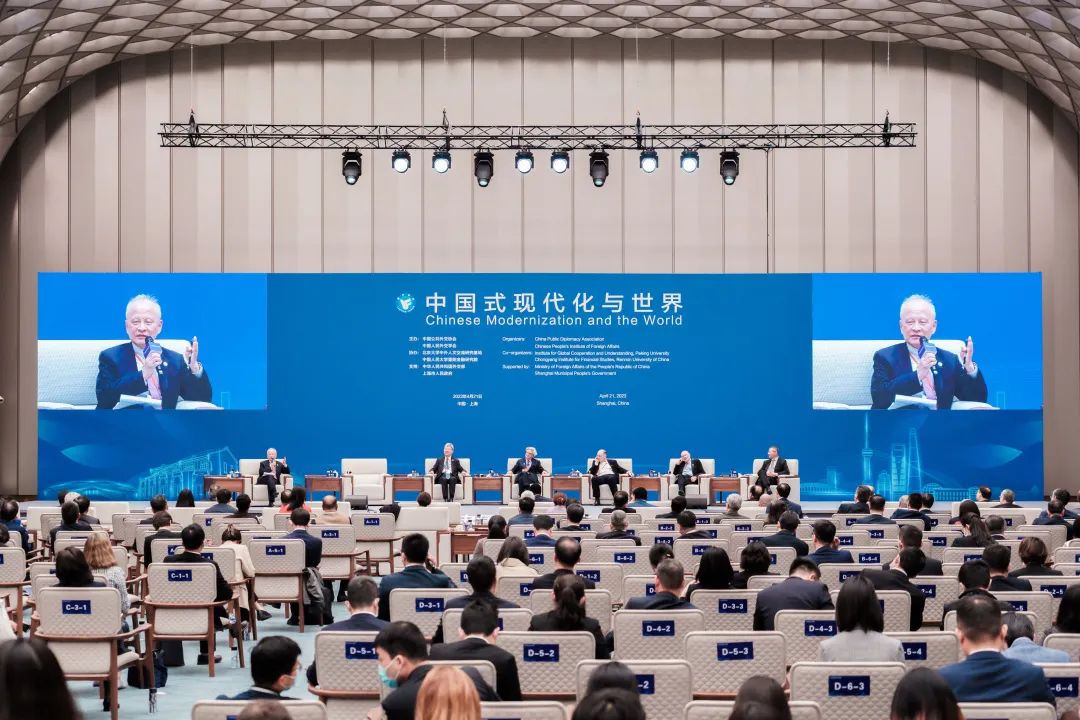 2023年4月21日上午,由中国公共外交协会、中国人民外交学会主办,北京大学中外人文交流研究基地、中国人民大学重阳金融研究院协办,中华人民共和国外交部、上海市政府支持的“中国式现代化与世界”蓝厅论坛在上海“世界会客厅”举办。国家主席习近平向论坛致贺信,国务委员兼外交部长秦刚出席论坛开幕式并发表主旨演讲(点击链接查看详情)。来自78个国家的政要、专家学者、工商界代表、外国驻华使节、国际组织驻华代表、国际媒体代表出席论坛,围绕“中国式现代化与世界”主题,就中国新发展、推动全球治理、人文交流互鉴、坚持高水平开放等议题进行深入交流。